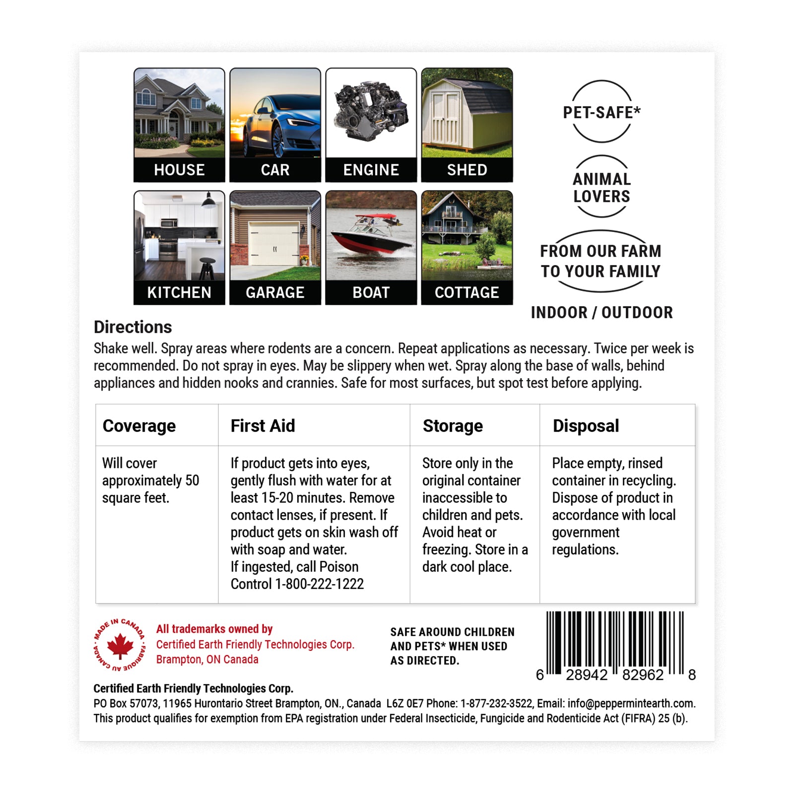 Powermint Mice Repellent is a powerful spray designed to keep mice away. Formulated with real natural peppermint essential oils. Peppermint is an extremely effective repellent for mice. Safe for your family when used as directed. Certified Earth Friendly. - Masters of Peppermint since 2010.